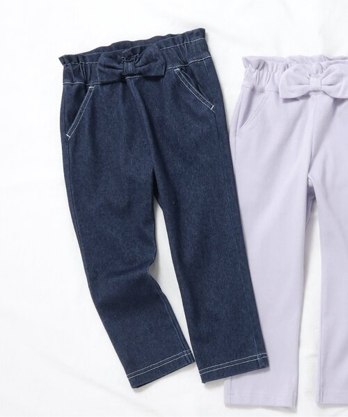 [ WEB限定アイテム ] ウエストのリボンが可愛いニットツイルパンツ* シンプルな長袖Tシャツやブラウスと合わせてナチュラルコーデに◎ 柄物のトップスとも相性抜群 さりげないオシャレで お出かけや通園通学も楽しくなりそう♪ 【取り扱い表示】 40℃を上限に洗濯機で洗濯、デリケートアイテムモード、ネット使用、漂白剤を使用禁止、色物は同系の色と一緒に、洗濯後直ちに取出し、タンブル乾燥不可、日陰で吊り干し、低温でアイロン、商業ドライクリーニング不可 【ご注意事項】 インディゴ染め・製品染め加工 この製品はインディゴ染料の使用または製品染め加工をしています。 1点ごとに風合いや色の出方、サイズ等が微妙に異なる場合がございます。 着用・洗濯時の摩擦や水濡れにより、色落ちをすることがございます。 洗濯は単独洗いで、長時間濡れたまま放置しないようにご注意下さい。 淡い色の衣類を着用の際は、十分にご注意いただき、他の製品に色移りした場合はすぐに洗濯してください。 着用やお洗濯を繰り返すことにより、風合いや色の変化をお楽しみいただけます。 この商品は着用中の摩擦や洗濯により毛羽の乱れ、毛羽脱落、毛玉が生じることが有ります。できるだけ美しくご利用頂く為に次のことにご留意下さい。 ○毛玉は毛玉取り器またはハサミで丁寧にカットして下さい。 ○毛羽が他に付着した際はテープやブラシで除去して下さい。 ○他の製品とは洗わず、単独でお洗濯して下さい。 ○タンブル乾燥はお避け下さい。 ※商品により多少の誤差が生じる事がございます。あらかじめご了承下さい。 ※ご使用のパソコンやブラウザの環境により、実際の色とは多少異なる場合がございます。 ※モデル着用写真についてはイメージの為、実際の商品とカラーや仕様が異なる場合がございますので、商品画像をご覧ください。 【 apres les cours -アプレレクール- 】 「キオク いろどる、こどもふく。」 大切なキオクを彩る、お気に入りの一枚。 「アプレ レ クール」は独自の色づかいやテキスタイルで日々をトクベツに過ごせる そんな「一枚」をお届けします。