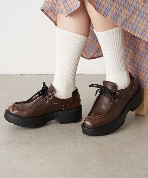 大人かわいいが叶うレザーシューズ▼ポイントキュートさと上品さを兼ね備えた厚底レースアップレザーシューズ。上質な本革を贅沢に使用し、履くたびに足に馴染んで味わいが深まり、自分だけの特別な一足に育ちます。厚底ソールは、さりげないスタイルアップ効果も嬉しいポイント♪どんなコーデにも馴染む万能デザインで、幅広く活躍します。▼スタイリングデニムパンツやオーバーサイズのトップスに合わせれば、可愛らしさとカジュアル感のバランスが絶妙なコーデに!ふんわりとしたフレアスカートやプリーツスカートとの相性も抜群!---------------------------------------------------※着用、お取り扱いの際は、商品についている品質表示とアテンションタグを必ずご確認下さい。※画像の商品はサンプルです。実際の商品と仕様、加工、サイズが若干異なる場合がございます。※可能な限り実物に近いカラーにて掲載していますが、撮影環境やモニター環境などにより製品と画像のカラーがやや異なって見える場合もございます。予めご了承ください。【お買いものをよりお楽しみいただく為に!!】▼商品のお気に入り登録(ハートマークをクリック)お気に入りアイテムの完売カラーの再入荷通知や、ラスト1点の通知、セールの通知も受け取ることができます。▼ブランドのお気に入り登録新商品や再入荷、クーポン配布などのお得な情報を受け取ることができます。