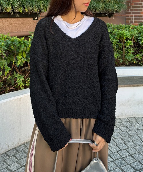 【ISOOK / アイスー】Vネックボアニット / ブークレーニット ぽこぽこニット ポップコーン編み 深Vネック セーター オフショルダー ワンショルダー レイヤード 重ね着 クロップド丈 ショート丈 短丈 黒 緑 ブラック グリーン ZOZOTOWN限定