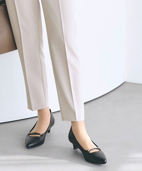 スリットデザインとメタルパーツが特徴的なパンプス。 【デザイン】 メタルパーツがモードな印象のミドルヒールパンプス。 スリットデザインなので、足指が少しのぞく上品なデザインです。 つま先のデザインもすっきりとさせているので、甘くなりすぎず通勤スタイルにも合わせやすいパンプスです。 安定感のある約4cmヒールでデイリーに使いやすい高さに仕上げました。 足に当たるつま先部分はジャージ素材で切り替えており、インソールのクッション中敷きで履き心地◎。 滑りにくいソールを使用しているのも嬉しいポイントです。 01/Sサイズ:23.0cm~23.5cm相当 02/Mサイズ:23.5cm~24.0cm相当 03/Lサイズ:24.0cm~24.5cm相当 ※照明の関係により、実際よりも色味が違って見える場合があります。また、パソコン・スマートフォンなどの環境により、若干製品と画像のカラーが異なる場合もございます。 【25SS】 店舗へのお問い合わせ商品番号:769-12007 ●製品寸法: S(23.0cm~23.5cm):ヒール高3.8cm 幅7.9cm M(23.5cm~24.0cm):ヒール高3.8cm 幅8cm L(24.0cm~24.5cm):ヒール高4cm 幅8.1cm 備考: