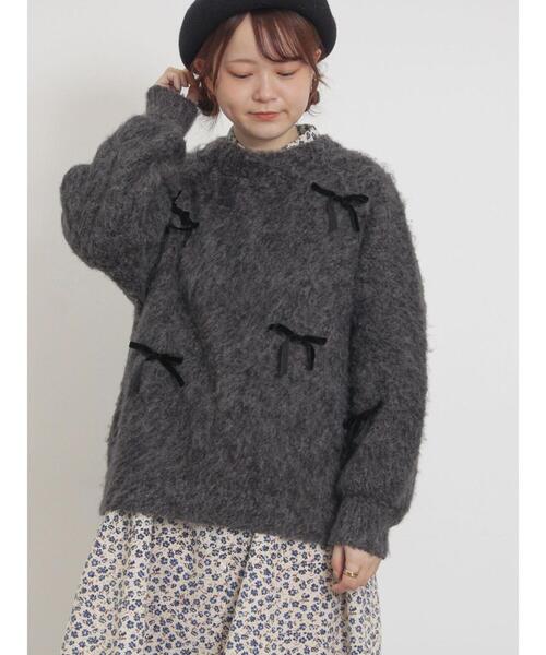 トレンドのリボン付きニットです。 ふわふわと柔らかくて軽い糸に、リボンは冬らしくベロアリボンを使用しました。 前身頃と袖のリボンはアシンメトリーにしています。 ※商品画像は、撮影環境やお客様のご利用のPC・スマートフォンのモニター環境などにより実物と色味に差異がある場合がございます。