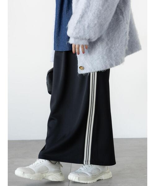 サイドラインがアクセントをプラスするナロースカート。Iラインシルエットで縦感を強調し、脚長効果が期待できるのも嬉しいポイントです。ウエストはゴム仕様で穿きやすく、ドロストでサイズ調整も可能。後ろ裾にはスリットが入っており、足元に軽やかなヌケ感をプラスします。落ち着いた配色で着回しもしやすく、デイリーユースにも重宝しそうな1着です。※商品画像は、撮影環境やお客様のご利用のPC・スマートフォンのモニター環境などにより実物と色味に差異がある場合がございます。【その他採寸】F ウエスト:[ゴム仕様]62cm