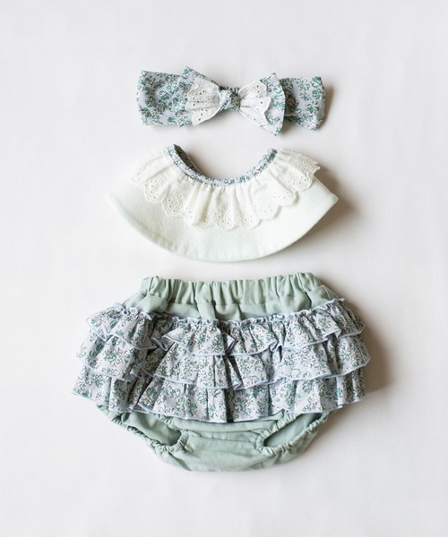 ヘアバンド、スタイ、ブルマをボックスに入れたギフトセットです。スタイの首周りに取り付けた大ぶりのコットンレースが、 ベビーのお顔まわりを華やかに引き立てます。 記念日の写真撮影や、お祝いの席にもおすすめ。 3ヶ月頃~1歳過ぎまで幅広いサイズに対応しているので 長い間ご着用いただけます。 出産祝いなどのプレゼントにもおすすめです。