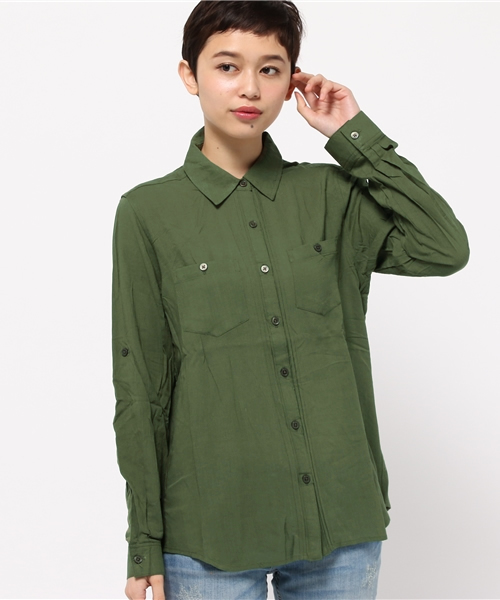 【Ciaopanic】 R/LiミリタリーSH清涼でなめらかな肌当たりが心地いいレーヨンリネンを使用した長袖シャツです。このこだわり抜いた風合いを活かしつつ、ミリタリーテイストに仕上げたデザインがこなれ顔。素材で差を付けた1枚をメインに、洗練度の高いカジュアルスタイルを楽しんで。袖はロールアップが可能です★