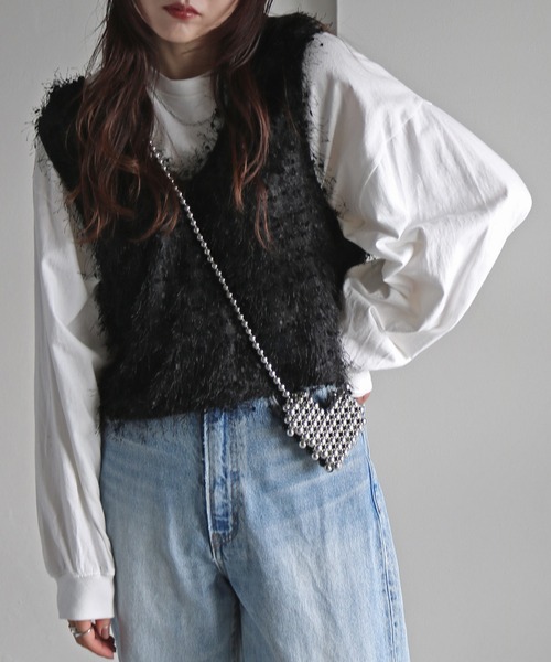 バレエコアな要素のあるリボンヤーン素材ビスチェ -detail- 長めな着丈のトップスからウエストインするコーデにも合う着丈で幅広い着こなしレイヤードが可能。 VネックとUネックでお好みのレイヤードで使い分けできる前後2Way仕様。 透け感のあるシアー生地なのでインナー次第で着こなしのバリエーションが豊富なのも魅力です。 -fabric- ストレッチ性と表面感に特徴のあるリボンヤーン素材。 -styling- シンプルなTシャツはもちろん、長めなシャツやニットトップスと合わせても大人可愛いスタイリングに。 デニムパンツやスラックスなどの組み合わせがおすすめです。 ラメやスパンコールなどの小物、メタリック素材のアイテムを取り入れるのが今の気分です。 レディースモデル身長:162cm