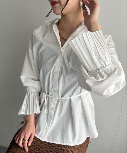 袖プリーツが印象的なブラウス。レイヤードも楽しめる春のおすすめの1着。◆2025春夏◆ 【デザイン・シルエット】 いろんな表情を楽しめるプリーツスリーブフレアーシャツ。 <POINT> ・一見シンプルな身頃もシルエットにこだわり、着こなしで表情が変わるシャツにデザインしています。 衿を抜いて着て頂くと、前見頃の裾に向かってドレープ感が出たり、リボンベルトを後ろで結んで頂くと女性らしいドレープがバックスタイルに。 ちょっとしたシルエットがこだわりの一枚となっています。 ・袖口にはレイヤードにうれしいプリーツスリーブ。暑くなってきてからもゴム仕様なのでプッシュアップして着こなして頂けます。 【素材】 肌に優しくなじむ柔らかなタッチとシワになりにくさがポイント。 しっかりとシャツらしい表情なのに、落ち感もあり柔らかなドレープを演出してくれます。 ご自宅でのお洗濯も可能でお手入れしやすく、デイリーユースにぴったりの一着。 ※カラーによって素材が異なります。 ホワイト、サックス、イエロー:ポリエステル 90% 綿 10% グリーン:ポリエステル100% 【カラー】 インナーにも使いやすいホワイトと一枚で今年の主役になるサックス、春のレイヤードにはピッタリのクリーム色、おしゃれに着こなせるグリーンストライプの4色展開。 【おすすめのスタイリング】 袖のディテールを活かしたレイヤードスタイルはもちろん、インナーに合わせて羽織として着て頂いたり、一枚着としても袖口が十分華やかに演出してくれます。 ----------------------------- 裏地:なし 光沢感:なし 透け感:ややあり(ホワイトのみ) 伸縮性:なし ボタン:あり(開閉可) 生地の厚さ:普通 その他仕様:紐ベルト付き等 季節:春、秋、冬 ----------------------------- 【モデル着用サイズ】 詳細モデル身長:168cm 着用サイズ:F ホワイトメイン着用モデル:168cm 着用サイズ:F グリーン・クリーム・サックスメイン着用モデル:160cm 着用サイズ:F ※画像の商品はサンプルです。実際の商品と仕様、加工、サイズが若干異なる場合がございます。 ※画像によっては実際の色味と異なる場合があります。正しい色味は生地アップ画像をご確認ください。