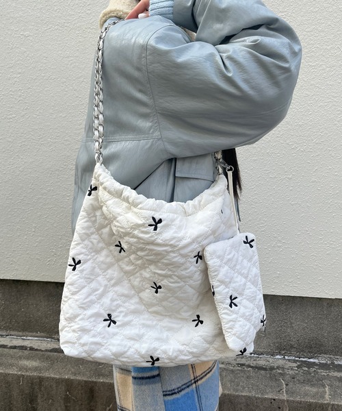 COMMENT □キルティングにミニリボンの刺繍が入ったショルダーバッグ □ミニポーチ付き □チェーンタイプのショルダー □巾着タイプのバッグ □A4収納可能 □内ポケット ATTENTION □商品写真はご利用のモニター環境や照明により、実物と色みに差異が生じる場合がございます。 □商品画像はサンプルのため、色味やサイズ等の仕様に変更がある場合がございますので、予めご了承ください。 □商品によって同サイズや同色等であっても各商品毎に誤差が生じる場合がございます。 □サイト上のカラー名と、お届け商品に記載されているカラー名が異なる場合がございます。 【poiregnée-select items-】 合わせるだけでトレンド感のあるコーディネートにアップデートできるファッションアイテムを、poiregnée独自の感性でセレクト。