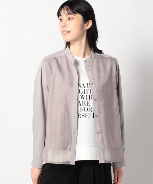オーガンジードッキング長袖ブラウス ボディ部分にシア素材がドッキングされており、レイヤードして着ているような雰囲気が出る、ノーカラーブラウスです。 カジュアルスタイルでもベーシックでも、スタイリングに取り入れやすいアイテムです。 本体部分は柔らかな肌触りと上品な光沢感があるブロード素材なので、きちんとした雰囲気が出ます。 前を開けると羽織としても着用可能なので、長いシーズン使えて便利です。 ■point 前丈は長すぎず、後ろに向かって長くなる、前後差のあるAラインデザインです。 ベーシックながら、動くたびに揺れるエアリーな可愛さがあります。 ■detail *前後差あり *袖口釦にポイントあり ■fabric …………………… 透け感:なし 裏地:ボディ部分2枚重ねデザイン 伸縮性:なし 光沢感:あり 生地の厚さ:薄い 洗濯方法:手洗い可能 …………………… ※詳しいお手入れ方法は商品タグをご参照ください ■coordinate *デニムパンツなどと合わせた、カジュアルMIXコーデがおすすめです。 *1枚での着用はもちろん、羽織りとしての着用も可能です。