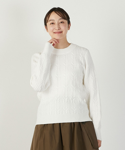 滑らかさのあるストレッチの効いた糸使い。ケーブル編みの凹凸感が上品な印象のコンパクトなクルーネックのニット。春を感じるパステルカラーもニットならではのカラーを取り入れやすいアイテムでオススメです。