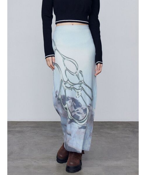 オリジナル柄がスタイリングのポイントに! ■デザイン 程よいキックバックとホールド力のあるリブ編みのニットマキシスカート。 オリジナルのメタリック柄グラフィックを総プリントした目を引く1枚です。 マキシ丈ですが、春夏向けのドライタッチな糸を使用する事で、サラッとした着心地。 体のラインを出さずに、程よくゆとりのあるシルエットです。 着用時にリブが伸縮する事で、ストライプ状に柄が伸びるのがポイント。 ■スタイリング スペイシーマークショートブルゾンや、バルーンコンパクトデニムブルゾンなどアウターのボトムとして合わせるのがお勧め。 ※着用画像はフラッシュの加減で実際の製品と色味等が異なる場合がございますので、生地のズームアップ画像をご確認ください。 ※ご利用の端末画面の設定により実際の商品と色味が異なる場合がございます。 【商品特徴】 透け感:なし 伸縮性:あり 生地の厚さ:普通 サイズ感:細身 裏地:あり ポケット:なし 【トクする便利機能】 ♡商品のお気に入り登録 再入荷時、ラスト1点の時、セール開始時にお知らせします。 ♡ブランドのお気に入り登録 新商品や再入荷、セール情報など、ブランドのお得な情報を受け取ることができます。 是非ご活用ください!