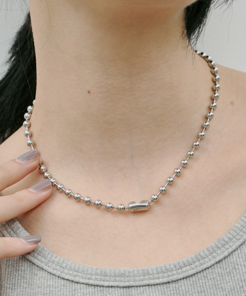 【AFF AIVER サージカルボールチェーンネックレス】ステンレスの中でもアレルギー性が極めて低く、錆びにくく丈夫で優れた特性を持つ特殊なサージカルステンレス素材を使用。ボールチェーンのデザインをそのまま活かしたシルバーネックレス。重量感のある見た目でも本体は軽量で付けやすいデザイン。留め具のコネクターにはAFF AIVERのロゴをレーザーで刻印。ボールのサイズはそれぞれ異なり、存在感のある大き目6mmのシルバーと定番のボールチェーンサイズ5mmのシルバー系の2種類。※カラー名は異なりますが、本体カラーは同一です。<同じデザインでブレスレットVer、サージカルボールチェーンブレスレット(問い合わせ番号/FAZUC256002)もあります。><スペック>全長(留め具含む) M/約39cm L/約44cm幅(ボール部分) シルバー/約6mm シルバー系/約5mm留め具(コネクター)※横幅 シルバー/約1.7cm シルバー系/約1.2cm ※サイズ目安です。0.5~1cm程度の誤差がある場合があります。【AFF AIVER/エイエフエフ アイバー】Anarchy / 51%realism主張がある中にも実用性を重視した表現する人の為の日常着a fucreation for AIVER※この製品はサージカルステンレス素材を使用していますが、体質によっては、かゆみ・かぶれを生じることがあります。皮膚に異常を感じた場合は着用を中止し、専門医にご相談ください。※引っ掛けや強い力を加えるとチェーン切れの原因となります。※取り外しを繰り返していくうちに留め具部分が緩む場合があります。※汗や温泉成分などにより本体が硫化し変色の原因になります。お取り扱い扱いにはご注意下さい。※商品画像はサンプルの為、色味やサイズ等の仕様に変更がある場合があります。※画像つきましては、光の反射によって実物と色味が異なって見える場合があります。予めご了承下さい。<商品のお気に入り登録>再入荷、残り1点、セールなどの通知を受け取ることが出来ます。<ブランドお気に入り登録>新商品や再入荷、ショップのおすすめトピックスなど、いち早くブランドのお得な情報を受け取ることが出来ます。