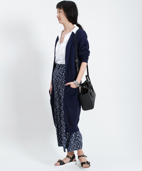 トレンドのロング丈を軽いコットンニットのカーディガンで。 肌触り抜群のハイゲージコットン紙を使用。 初夏~初秋にかけての羽織として最適です。 ボタンのないすっきりとしたデザインに、パッチポケットがポイントに。 ロングでも軽くて薄い素材なので、着こなしやすい一枚です。