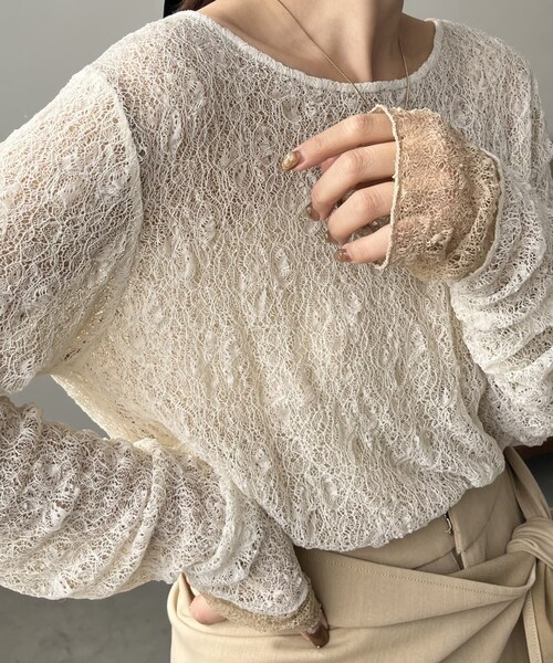 リバーシブル仕様のレーストップス商品ポイント・2色のレースが重なったリバーシブル仕様のトップス・透け感のあるレースが2枚重なることにより透け過ぎずに着られる・伸縮性のあるレース生地で着心地も◎・リバーシブルなのでコーディネートによりカラーを変えて2WAYで着られるスタイリングポイント・表の袖を捲って裏のカラーをチラ見せさせて着るのがおすすめ・オケージョンやセレモニーシーンにもおすすめ【エクリュ着用アイテム①】comming soon【エクリュ着用アイテム②】comming soon【ブラック着用アイテム①】タックストレートパンツ【ブラック着用アイテム②】comming soon【ブラック着用アイテム③】comming soon**********************透け感:ホワイトあり裏地:あり伸縮性:あり光沢感:なし**********************※店舗へは1/23の入荷を予定しております。(配送状況等により予告なく日程が変動する場合がございます。)▼洗濯方法手洗い可能※この製品に使用しているレース糸及び素材の特徴上、引っ掛け・引っ掛かりにより糸が飛び出したり、ひきつれが生じやすい性質をもっております。また、激しい運動や強い力がかかると、滑脱(縫い目が滑って開いたり、縫いしろが抜ける)したり目寄れ(織り糸が滑って片寄り、織り目が開く)が生じる性質をもっております。美しい外観を保つ為、着脱時及び、着用・クリーニング時には次の点に十分ご注意ください。※撮影場所やお使いのモニター環境により若干お色味が異なる場合がございます。特にロケの撮影では明るく見える傾向にございます。※商品はサンプルで撮影をしております。若干の仕様が変更になる場合がございますので予めご了承の上ご注文くださいますようお願いいたします。▼商品のお気に入り登録完売カラーの再入荷通知や、ラスト1点の通知、セールの通知も受け取ることができます。▼ブランドのお気に入り登録新商品や再入荷など、いち早くブランドのお得な情報を受け取ることができます。