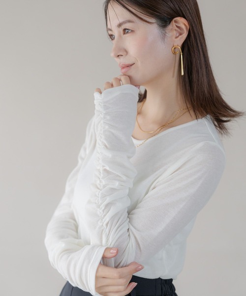 大人の美しい透け感が魅力のトップス 薄手でソフトな肌触りのカットソー素材を使用したプルオーバー。 着ぶくれせずにスッキリとレイヤードスタイルが決まるのが嬉しいポイント。 上品な肌見せが叶うので大人の女性にもおすすめの一品。 すっきりとしたシルエットで高見えなスタイリングに取り入れるのも〇 ーーー 袖が長めのシャーリングになっており、ニットなどのトップスの袖口からシャーリング部分をのぞかせるだけで 鮮度のあるこなれた着こなしに見えるので1枚あると便利です。 【素材】 ・薄手でソフトな肌触りのカットソー素材 ・大人の肌見せを叶える上品なシアー感 【悩みに“効く”ポイント】 ・レイヤードスタイルに華やかさをプラスできる ------------------------ 【お気に入り登録のおすすめ】 ■商品のお気に入り(♡)登録 ┗完売カラーの再入荷通知や、完売間近の通知、ZOZO店のみのセールなどの通知を受けることができます。 ■ショップのお気に入り(♡)登録 ┗新商品や再入荷など、いち早くブランドのお得な情報を受け取ることができます。 ------------------------