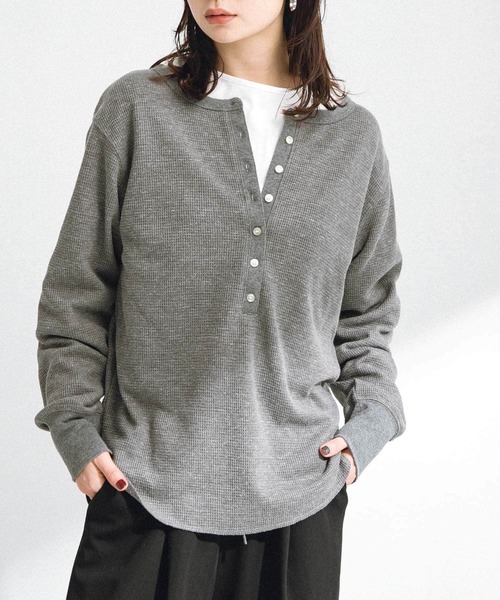 このアイテムはWEB限定商品です。季節の境目に重宝するワッフル素材ロンT程よい身巾と裾や袖のロック始末など、大人カジュアルを演出する一枚です。深めに取ったヘンリーの前開きで華奢見え効果も◎POINT・シンプルで長くお使いいただけるデザイン・1枚でサマになるデザインCOORDINATEワッフル素材はカジュアルになりがちなので、釦を開けて抜け感を出すのがおすすめ。デニムと好相性。スカートと合わせる場合はボリューム感の少ないものが◎【2025 Spring/Summer】【25SS】※この商品は、素材の特性上、着用の際ピリング(毛玉)が発生する場合があります。ピリングは引っ張って取ろうとせず、小さなハサミなどで丁寧に取り除いて下さい。※商品画像は、光の当たり具合やパソコンなどの閲覧環境により、実際の色味と異なって見える場合がございます。予めご了承ください。※商品の色味の目安は、商品単体の画像をご参照ください。▼お気に入り登録のおすすめ▼お気に入り登録商品は、マイページにて現在の価格情報や在庫状況の確認が可能です。 お買い物リストの管理に是非ご利用下さい。素材感透け感 : ややあり(オフ)伸縮性 : ややあり裏地 : なし光沢 : なしポケット : なしFREE