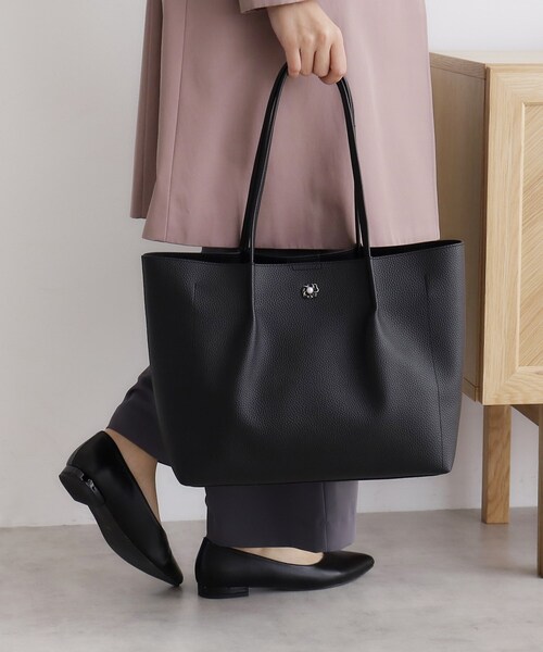 A4サイズが収納可能な合皮トートバッグ 【デザイン】 ・フラワーカシメがついた軽量合皮を使用したトートバッグ ・両サイドにあおりポケットがあり、小物を仕分けるのに便利な内側ポケット付き (内側ポケット3つ) ・ファスナー付きで安心感もあるデザイン 【着こなし】 ・通勤としても使用でき、容量が入るのでお出かけの際にも使えるデイリーなアイテム。 【仕様】 ・ポケット数:内側×3 ・A4ファイル収納可 ※照明の関係により、実際よりも色味が違って見える場合があります。また、パソコン・スマートフォンなどの環境により、若干製品と画像のカラーが異なる場合もございます。 店舗へのお問い合わせ商品番号:C59-12003 ●製品寸法: 00:高さ27cm 幅(上部)40cm 幅(下部)32cm マチ12cm 持ち手上がり23.5cm 備考:重量:約385g