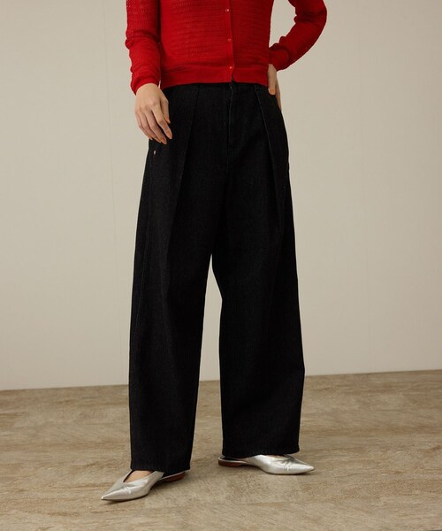 【デザイン・シルエット】 ワンタックのワイドシルエット。腰回りがすっきり見えるパターンでおつくりしていますので、デニムながらきれいめに着用可能。加工感にもこだわり、岡山のデニム工場で縫製し岡山素材を使用した『地産地消』でサスティナブル、JAPANクオリティを意識した商品となります。同素材でストレート型もあり。 ※実際の商品には革パッチがつきます。 【おすすめのスタイリング】 合わせやすいシルエットで、ニットやブラウスだけでなく、ツイードアイテムとの合わせでカジュアルダウンなスタイリングも〇 【素材】 日本で最も有名なデニム生地産地の岡山県井原市に位置する、デニム老舗生地メーカー「KUROKI」(クロキ)の12.5oz/綿100%デニム素材。 重すぎない雰囲気で着用でき、本物さながらのビンテージのような加工感が特徴。あえて柔軟で柔らかくして、女性らしい雰囲気で着用できるよう加工しています。 ---------------------------- 透け感:なし 裏地:なし 伸縮性:なし 光沢感:なし 生地の厚さ:中肉 ポケット:あり 開き方:ファスナー ---------------------------- 【モデル情報】 モデル身長:171cm 着用サイズ:38 ※画像の商品はサンプルです。実際の商品と仕様、加工、サイズが異なる場合がございます。 ※撮影場所やライティング、お使いのモニター環境によって色の見え方が異なる場合がございます。 ※商品のカラーは画像の色味をご参照ください。動画は仕様説明のため、色味が実物と異なる場合がございます。