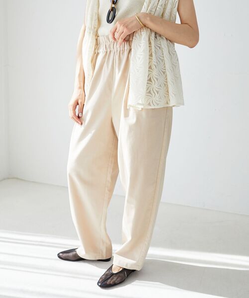 《WEB限定アイテム》 軽やかな着心地とふんわりとしたシルエットにこだわったイージーパンツが登場。 生地は涼し気なコットン麻の生地を使用しました。 程よく肌離れし、脚のラインを拾わずすっきりと着用いただけます。 ●ポイント ウエストがくしゅっとしたデザインデザインで、シンプルなトップスと合わせてもこなれた印象に。高身長の方から低身長の方まで使えるサイジングです。 ●おすすめコーデ 普段のお出かけはもちろん、旅行やリゾートにも活躍するリラックスパンツです。