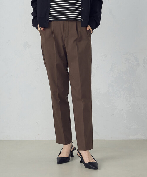 \シリーズ累計30000本突破!仕事にも週末にも。着回し力No.1パンツ/ ちょうどいい『デザイン』ベーシックだけと、今らしいシルエット。 程よいゆとり。 ちょうどいい『プライス』高すぎず、安すぎず、程よいプライス。 程よい素材。 さまざまなシーンや毎日に 『ちょうどいい』 ビジネス、おでかけ、普段着と、その時々のライフシーンに ちょうどいいテーパードパンツ。 ■おすすめポイント ・ストレッチ性・・高い伸縮性で動きやすさ抜群!リラクシーでラクチンな穿き心地 ・美シルエット・・太ももから裾にかけて細くなるすっきり見えテーパードシルエット ・質感・・・適度なハリと弾力のある素材で、美しいシルエットを保ちます ・ウエストゴム・・後ろウエストゴム仕様できれいめ、らくちんな穿き心地 ・イージーケア・・シワになりにくく、ご自宅でのお洗濯が可能。お手入れ簡単。 ・豊富なサイズ展開・・XS~XLの幅広いサイズ展開 《デザイン》 太ももから裾にかけてテーパードがかかった、美しいスッキリとしたシルエット。 センタープレスで、足のラインをスッキリ。 お仕事からお出かけまで、シーンを選ばず使えるデザイン。 高いストレッチ性で、1日穿いていても心地よく。 後ろはゴムで楽ちんだけど、フロントはベルトでキレイみえ。 ベルトループもついて、お洒落の幅も広がります。 ふくらはぎが細身えする絶妙なテーパードラインと、 華奢見えが叶う、くるぶしが見える9分丈。 センタープレスが足のラインを美しく。 フロントのタックが、程よいゆとりで、 着心地よく体のラインを拾い過ぎないので、 気になる腰回りもカバーします。 《同シリーズ》 下記品番は、同デザインになります。 品番:38-52PM56-205 展開カラー:ネイビー、テラコッタ、チャコール、グレッシュベージュ 《素材》 高いストレッチ性を持つレーヨンナイロンのツイル素材です。 キックバック性も高いため、所謂「膝が出る」現象が発生しにくく、 長期間ご愛用いただくことが可能です。 さらっとした生地感で肌離れも良く、 春夏でも快適に着用いただけます。 …………………… 透け感:なし 厚さ:中肉 伸縮性:あり 洗濯方法:洗濯機可 …………………… ※画像の商品はサンプルとなりますので実際の商品と仕様、加工、サイズが若干異なる場合がございます。 ※こちらの商品はFIVE FOXes独自の採寸方法となっています。 本サイトのサイズガイドと採寸方法が異なる場合がありますのでご了承ください。