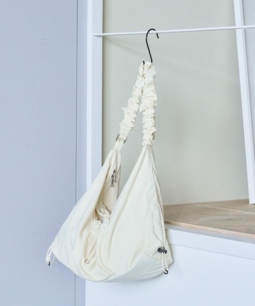 ドロストデザインがポイントのショルダーバッグ。フロントと内側にポケットを配し、小物の整理にも便利。両サイドのコードで、バッグのシルエットを変えてお楽しみいただけます。ショルダーは長さ調整が可能。大容量なのでデイリーにお使いいただけ、幅広いコーディネートに合わせやすいアイテムです。
