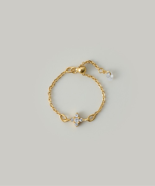【華奢さと華やかさを兼ね備えたリング】 華奢なチェーンにスワロフスキーのクローバーモチーフを合わせたチェーンリング 他のリングとの重ね付けはもちろん、 単品使いでも手元を華やかに彩ってくれます シリコンボールのアジャスターが付いているので フリーサイズでどの指にもご利用いただけます 【素材】 真鍮(K18 Gold Plated) 本体部分に真鍮(銅をベースに20%以上の亜鉛を含んだ合金)を使用しております。 真鍮は耐久性に優れ、コーティングや金属の接着がしやすい特徴がございます。 一方で酸化しやすく、空気中の酸素と結合し、徐々に表面が黒ずんでくることがデメリットとして挙げられます。 JolieToujoursでは皆様の日常に寄り添った、デイリーユースのしやすいデザイン、末永く使える素材にこだわっております。 真鍮にK18(75%の純金を含む合金)で通常の5倍~10倍の厚さのコーティングを施すことで ・色持ちがよく変色に強い素材。 ・傷に強く、金属アレルギーも起こりにくい素材。 を使用しております。 また、長年ご利用いただき変色してきた場合でも、再コーティングを行うことでご購入時と同じ色味に戻すことも出来るため、 身に着け一緒に過ごした時間の想い出や想い入れはそのままに、メンテナンスを行いながら半永久的にご利用いただけます。 K18本来の肌なじみのよい柔らかなゴールドカラーをデイリーユースのしやすいJolieToujourのデザインに落とし込んだ「ライトジュエリー」は、 お手ごろな価格で半永久的にご利用いただけます。