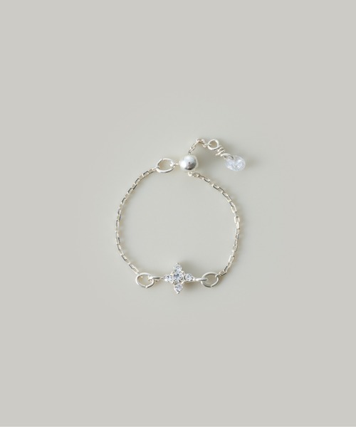 【華奢さと華やかさを兼ね備えたリング】華奢なチェーンにスワロフスキーのクローバーモチーフを合わせたチェーンリング他のリングとの重ね付けはもちろん、単品使いでも手元を華やかに彩ってくれますシリコンボールのアジャスターが付いているのでフリーサイズでどの指にもご利用いただけます同モチーフのネックレスやブレスレットと合わせてセットアップコーデもぜひお試しください。【素材】Silver92592.5%の純銀に他の金属を7.5%混ぜた金属を使用しております。Silver925は金属の強度が高いため、真鍮などの金属よりも華奢で繊細なデザインを可能にしております。JolieToujoursではお手入れがしやすいようSilver925商品にはあえてコーティングを施しておりません。コーティングがないことで研磨剤の入ったシルバー磨きでのお手入れを可能にしているため変色してもお手入れをしながら色味を戻し、ご購入時の色味で半永久的にご利用いただけます。Silver925本来のシルバーカラーをデイリーユースのしやすいJolieToujourのデザインに落とし込んだ「ライトジュエリー」お手ごろな価格で半永久的にご利用いただけます。