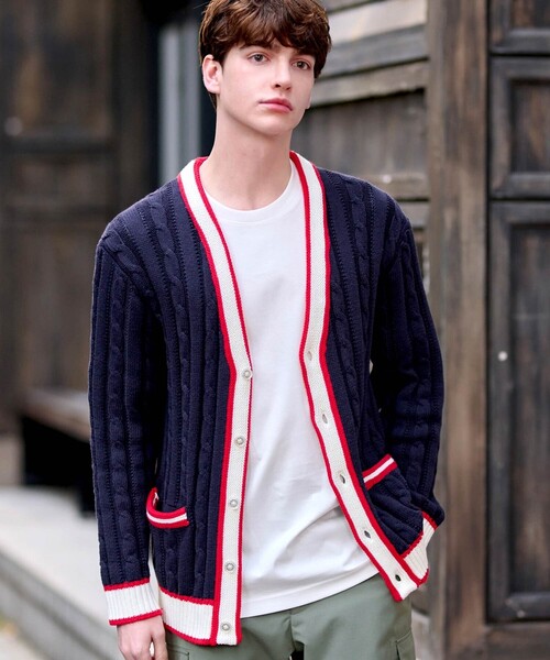 《冬はコートのインナーとして、春の羽織として着回しできるチルデンニットカーデ》素材は綿、アクリルを使用し、綿の肌触り良さを活かしながらアクリルを入れることで、毛羽を抑え柔らかい風合いになっています。太さのあるケーブルの編み構造にこだわることで絶妙な立体的のある柄に仕上がっています。肉厚でしっかりとした素材感ですが、綿を使用しているので清涼感があり春先まで長く使用していただけます。デザインは前立てリブ、ポケットなどに配色のラインを入れることで他では買えないオリジナリティのある商品です。サイズ感は、ややゆとりのあるサイズ感でコートのインナーとしても一枚で羽織としても使用いただけます。【仕様】・ポケット数:横×2※照明の関係により、実際よりも色味が違って見える場合があります。また、パソコン・スマートフォンなどの環境により、若干製品と画像のカラーが異なる場合もございます。店舗へのお問い合わせ商品番号:086-12010●製品寸法:90(S):着丈65cm B100cm 袖丈55cm 肩幅43cm91(M):着丈68cm B104cm 袖丈57cm 肩幅45cm92(L):着丈71cm B108cm 袖丈59cm 肩幅47cm備考: