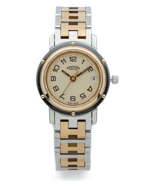 An elegant, authentic vintage Hermès watch with a mixed-metal bezel. A date wheel accents the 3-hand dial. Brushed logo links accent the polished bracelet. Hinged-snap clasp. Made in Switzerland. Measurements Dial: 0.75in / 2cm Band: 0.5in / 1cm Length: 6.25in / 16cm