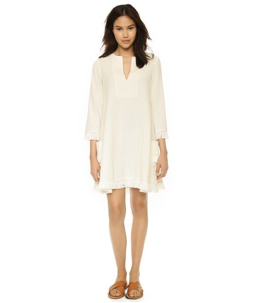 Fine strands form a loose, woven pattern on this BCBGMAXAZRIA dress. Fringe trim creates a vintage-inspired finish. Low patch pockets. 3/4 sleeves. Unlined. Fabric: Loose, patterned weave. 100% cotton. Hand wash. Imported, China. Measurements Length: 31in / 79cm, from shoulder Measurements from size S