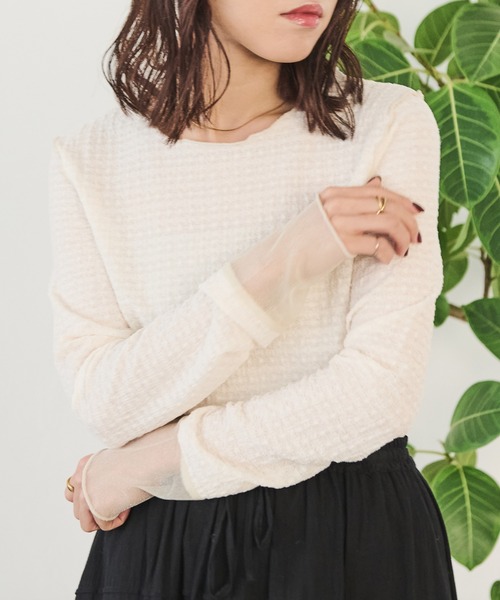 【ぽこぽことした生地感のジャガード生地とラメシアー素材を組み合わせたデザイントップス】 ・切り替え部分のメロウデザインがアクセント ・やや長めの袖丈で手元を華奢に、ラメシアー素材の透け感がポイントに ・バックにも施されたセンターシームデザインで後ろ姿も抜かりなく ・程よくタイトなシルエットですっきり見えが叶うのも魅力的 ・きれいめな細身デザインですが、ストレッチ生地が伸縮性抜群で着心地◎ ・コーデを華やかにするブルーとイエロー、ベーシックに着回ししやすいアイボリーの3カラー展開です ~スタイリング~カーディガンやベスト、ワンピースのインナーとしてはもちろん、 デザイン性があるので1枚でのメイン使いにもおすすめです。 デイリー使いしやすく、合わせるアイテム次第できれいめにもカジュアルにも幅広く活躍します。 - - - - - - - - - - - - - - - - - - - - - - - - - - - - - - - - - 透け感:ややあり(袖口のみあり) 裏地:なし 伸縮性:あり 光沢感:なし ポケット:なし 洗濯: 洗濯可能 - - - - - - - - - - - - - - - - - - - - - - - - - - - - - - - - - ※着用、お取り扱いの際は、商品についている品質表示とアテンションタグを必ずご確認下さい。 ※サンプル商品で撮影をしております。生産時の生地のロット違いによる色の差が生じる場合もございます。 お使いのデバイスにより商品写真のお色が実物と異なって見える場合がございます。不良品ではございませんのでご了承くださいませ。