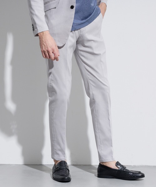 ■デザイン イージーパンツ仕様のスラックスデザイン。 素材感を活かしたシンプルな飽きの来ないデザインに仕上げています。 同素材でパンツ「5165-3530」を展開しておりますので、セットアップでのスタイリングもおすすめです。 ■サイズ ウエストベルトには平ゴムとスピンドルを通していますのでサイズ調整しやすく、少しお尻廻りから渡りにかけてゆとりのあるサイズ感にしています。 その渡りから裾口にかけてテーパードした綺麗なシルエットです。 ■素材 吸湿性の高い再生繊維のレーヨン糸とプリッとしたコシを出すナイロン糸を使用したスラブデニム調のハイパワーストレッチ素材を使用。 スラブ部分にブライトのポリエステル糸を使用する事で他にはない高級感のある光沢を出しています。 キックバックの利いたストレッチ性とシャリ感のあるサラッとした風合いは肌触りも抜群です。 伸縮性:あり 生地の厚さ:普通 裏地:無し ■注意点 摩擦によりピリングが起こることがあります。