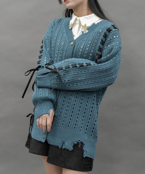 POETIQUE oriental collection♡ 縁を結ぶ組紐をイメージしたオリエンタルな雰囲気漂うシリーズ♡ 【デザイン】 透かし編みのニットカーディガンにレースアップデザインを大胆にあしらったアイテムです。 ダメージ加工を入れてハードな印象に仕上げました。 長めの丈感で春先まで使える万能アイテムです。 【コーディネート】 こちらはタックデザイン袴パンツ(TS242X12P)と合わせたコーデがおすすめです。 ロング丈合わせでゆるりとした抜け感のあるコーデも◎! ▽ axes femme POETIQUE * アクシーズファムポエティック 【Concept】 一編の詩のように紡がれる、 柔らかな色や優しいモチーフに心を弾ませて。 夢見る気持ちを忘れない、とっておきのクローゼット。 フリルやオリジナルプリントをあしらったガーリーなアイテムと デイリー使いにもおすすめのトレンド感もあるガーリーカジュアルなアイテムで 王道ガーリースタイルからミックスコーデまで様々な着こなしがお楽しみ頂けます。 #サブカル #地雷 ********************** .。.: お気に入り登録のおすすめ :.。. ∇気になるアイテムを登録∇ ハートをクリックしてお気に入りに登録すると 完売カラーの再入荷やラスト1点の通知、セールの通知を受けとることができます。 ∇ブランドを登録∇ 新商品や再入荷、セール通知など、いち早くブランドの情報を受けとることができます。 是非ご利用頂き、お買い物をお楽しみ下さい。 .。.: 商品について :.。. ・サイト上のカラー名と、お届け商品に記載されているカラー名が異なる場合がございます。 ・商品の色味は、撮影場所や光のあたり具合、お客様のお使いのPCのモニター環境などにより色味が違って見える場合がございます。 予めご了承の上ご注文下さい。 .。.: 返品・キャンセルについて :.。. ・着用、洗濯後の返品は致かねます。 ・商品到着後、着用前に商品を確認して頂きますようお願い致します。