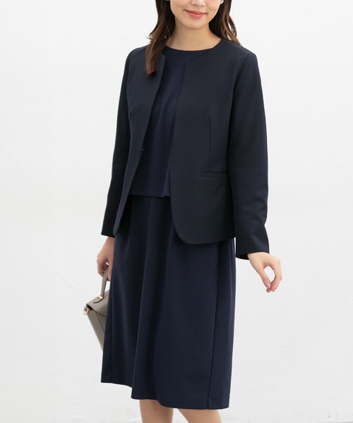 大切な日も、日常も【デザイン】1枚でコーディネートが完成する、ブラウスとスカートのセットアップ風デザイン。ブラウス部分は華奢見え&スタイルアップ効果のあるコンパクトな短め丈。【素材・機能】さらっとした肌触りでブラウス見えするカットソー素材。程よい厚みで伸縮性もあり着心地抜群。洗濯後もシワになりにくい『イージーケア』の機能付きで、お手入れもラクラク。【スタイル】ジャケットと合わせてお仕事に、華やかなコサージュやブローチをつけて入学・卒業式などのセレモニーシーンにと、きれいめスタイルに大活躍。■着用ジャケット9分袖Aラインノーカラージャケット( 773-41-8388 )※9分袖※裾後中心ベンツあり品番:534-51-9317