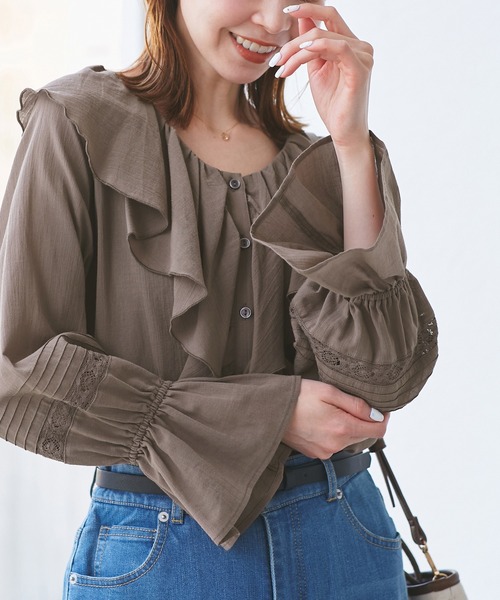 気軽に羽織って、身軽におでかけ!軽やかに舞うラッフルブラウス。【素材感】 ・軽やかな綿ボイル素材で快適な着心地。 ・ひんやりとした肌触りの接触冷感。 ・空気の通りやすい通気性の良い素材を使用。 【デザイン・シルエット】 ・フロントにかけてたっぷりとあしらわれたラッフル襟が特徴。 ・ギャザーを入れたキャンディスリーブデザイン。 ・ロングシーズン着回せる前開きの長袖ブラウス。 【カラー】 ・ブラック、オフホワイト、サックスブルー、ブラウン、イエローの5色展開。 ・イエロー(80)は新色。 【スタイリングポイント】 ・ラッフルはウエスト位置まで施されており、裾をボトムインしてももたつきなし。 ・ワイドパンツやフレアパンツでヒッピーなムードに。 ・オフホワイトやサックスブルーは、同系色のボトムで軽やかにコーデすると◎。 ・KIDS(品番:GRH25030)も展開しているので、親子お揃いも一押し。 <お着軽シャツシリーズ> ・お着軽シャツシリーズ/綿ボイルペプラムシャツ(品番:GDH15510) ・【KIDS】お着軽シャツシリーズ/綿ボイルシャツ(品番:GRH25030) ・お着軽シャツシリーズ/綿ボイルガウンワンピース(品番:GDE15500) ・お着軽シャツシリーズ/綿ボイルバックタックシャツ(品番:GDH15500) ----------------------------- 裏地:なし 透け感:ややあり 伸縮性:なし 生地感・厚さ:やや薄手 季節:春・夏・秋 ----------------------------- ※撮影時の光、お使いのモニター環境によって色の見え方が違う場合がございます。 ※モデル身長:165cm 着用サイズ:38