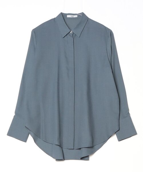 《デザイン》着丈に前後差をつけた略比翼仕立ての長袖、台襟付きシャツカラーです。一枚着はもちろん、後ろの着丈がヒップ下あたりなので中にタートルネックを着て、パンツ合わせで着てもきまります。前を開けて羽織りとしても着られます。きちんとアイロンしなくても雰囲気のある素材なので扱いやすさもポイントです。《素材》暖かみのある素材で、糸自体も柔らかく膨らみがあります。ウール素材に多い、チクチクした肌触りの感覚もありません。家庭洗濯もでき、取扱いが簡単なのも特徴です。