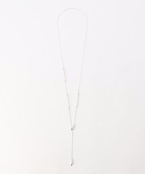 《デザイン》3mmサイズの極小のスワロフスキーパールとしずく型のシリコン入りストッパーを組み合わせたシンプルなロングネックレスです。〔スワロフスキー社〕のパールは形や穴が正確につくられており、チェーンに通した時に綺麗にパールが並ぶ為、小さくても高級感のある仕上がりになります。十粒並べたパールの間に極小のシリコン入りストッパーを入れています。シリコンパーツを移動させて、パールを好きな位置に留められます。しずく部分を前にしてY字ネックレスのように着けたり、 反対にしてパールを前にしてシンプルなパールネックレスのようにしたり、しずくパーツのすぐ上にパールを集めたりと様々なアレンジが可能なデザインです。《素材》フェイクパール(ガラス・スワロフスキー)、合金、ガラスチェーン部分…真鍮(代用ロジウムメッキ)《注意事項》しずくパーツとチェーンの繋ぎ目、チェーンとエンドパーツの繋ぎ目等は、大変繊細なつくりになっています。長さを調節する際は、必ず繋ぎ目に負荷がかからない位置のチェーン部分を持って行ってください。パールを移動させる際、シリコンストッパーは必ず一粒ずつ移動させて下さい。無理やり移動させると破損することがあります。使用後は乾いた布で拭き、市販の研磨剤入りのクリーナー等は使用しないで下さい。