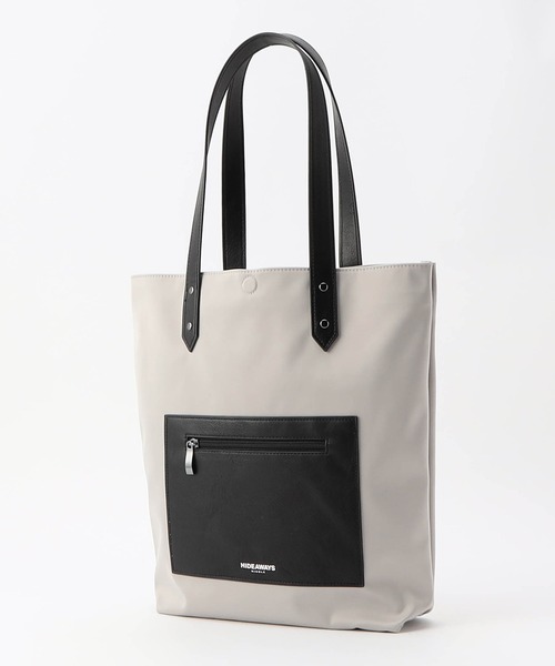 ■デザインポリエステルの布帛素材と合成皮革を組み合わせた異素材使いデザインのトートバッグです。ハンドル部分とフロントポケットを合皮素材で切り替えてシックに仕上げました。金具類を全てブラックニッケルで統一することにより、洗練された印象を表現しています。内装にもポケットを設けて荷物の仕分けも容易です。■サイズメインポケットはA4サイズ対応で様々なシーンに対応可能です。マチ幅は細めに設定してスタイリッシュな印象に仕上げました。ハンドルの長さは手持ちも肩掛けもできるように設定しています。■素材本体には程よい光沢感となめらかな手触りが特徴のポリエステルツイル素材を使用。別生地にはランダムなシボ感が高級感を醸し出す合成皮革を使用し、引き締まった印象に。■注意点この製品はポリウレタン樹脂コーティングをした合成皮革を使用しています。このポリウレタン樹脂は年数の経過とともにヒビ割れ・剥離等の経時劣化が生じます。現在の技術ではこれらの現象を止める事は難しく、ご使用の際は予めご了承ください。