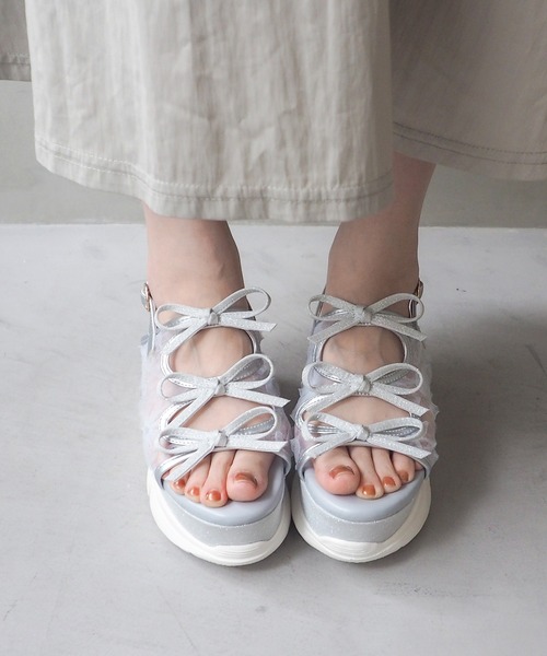 ━━━━━━━━━━2026 Spring & Summer━━━━━━━━━━ 【商品説明】 +8cm盛れる♡ 大人ロマンティックな三連リボンサンダル昨年大人気だった三連リボンサンダルが、素材をアップデートして再登場。 アッパーはチュールからフラワーレースにチェンジ。よりロマンティックで、ぐっと華やかな印象に仕上がりました。グリッターソールも上品な“微ラメ”仕様に。キラキラしすぎず、大人っぽく履けるのがポイントです。 厚底で+8cmスタイルアップ。少し傾斜のあるソール設計なので、脚がすらっときれい見え。見た目はボリューム感たっぷりでも、ヒール高を感じにくい安定感のある履き心地です。 甘めコーデはもちろん、デニム合わせでカジュアルダウンするのも今っぽい。 同じグリッターソールを使ったサテンリボンデザインも展開中「No.8990005」 ──────────【✨履きやすさのPoint】・足をしっかりホールドするデザインで安定感◎ ・インソールのクッションでふわふわの履き心地 ・ソール全体に厚みがありヒール高を感じない ──────────【⚙Spec|素材&サイズ感】・裏地:合成皮革・伸縮性:なし・柔らかさ:★★★☆☆(ふつう)・サイズ感:大きめ!好みによってワンサイズ下げてもよいかもしれません・片足の重さ:約 380g ──────────【🗣Staff Review】 スタッフ:Mizuki.A 着用サイズ:LL(普段通り)足型:ワイズE/やや広め コメント: いつものサイズでジャストでした。カカトもつま先もサンダルからあふれず、ちゃんと収まります。私の大きな足でも足幅には余裕があったので、甲が低い方や幅が細い方はワンサイズ下げたほうが良いかもしれません?トゥスプリングが適度にあるのでとても歩きやすく、傾斜はほぼ無いので安定感もばっちりでした。 ──────────【🏷Brand|byあしながおじさん】カジュアルの楽しさを、もっとライトに。**“ちょうど良い今っぽさ”**をお届けするブランドです。Instagram:ashinagaojisan_gram ──────────【🔎 安心してお買い物いただくために】 【❗Attention|ご購入前にご確認ください】・掲載画像はサンプルのため、仕様が異なる場合があります・光の加減やご覧いただく環境により、色味が異なる場合があります・雨や汗による色落ち、衣服への色移りにご注意ください・包装紙・箱・タグに破損があっても、商品本体に不良がない場合はそのまま出荷させていただいております ──────────【📦返品・交換について】・ご試着後の返品・交換はお受けできません・商品に不備がある場合は、注文履歴からお問い合わせをお願いいたします ──────────【♥お気に入り登録でお得】完売→再入荷通知在庫わずか通知 “逃したくない!”を、ひと押しで回避✨