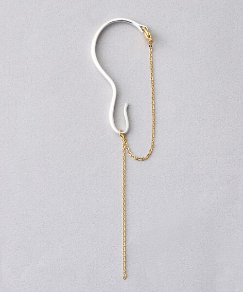 滑らかに描かれる大きな曲線が、耳もとを華やかに彩る「イヤーバングル」。 見え方が新鮮なアイテムは、周りと一味違う個性を発揮します。 シンプルなイヤーバングルとチェーンチャームがセットになった、モード感たっぷりのアイテム。 チャームのゆったりとした揺れ感が大人の余裕を感じさせる表情をつくります。 耳を囲むようなシルエットはインパクト抜群。 チェーンをストレートにおろす際は、髪を下ろしたスタイルに取り入れるとこなれた印象に。 チャームは取リ外し可能なので、イヤーバングル単体でもお使いいただけます。 その日の気分に合わせて3通りのアレンジを楽しんで。 定番化したスタイリングを一新し、モダンな雰囲気へと導く逸品です。 ※イヤリング部分を調整して、耳の厚みに合わせることが可能です 開閉を繰り返すと金属疲労により破損することがございますのでご注意ください ※必ず顔側にアール部分が来るように装着してください ※片耳用の商品です
