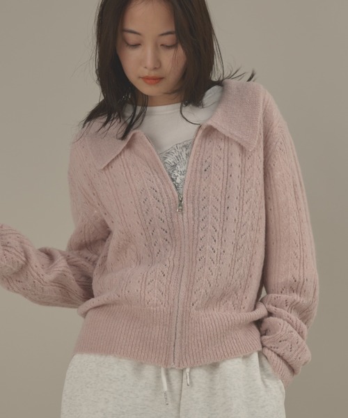透け感のあるローゲージで編み上げたジップカーディガン■デザイン/素材寒い冬のインナーから春先のアウターまで活躍するジップニットカーディガン。透け感のあるケーブル編みで仕上げることで緩いサイジングと相性の良いカジュアルデザインに。大きめの襟がスタイリングのさりげないアクセントに。■スタイリングカットソーの上から羽織ってレイヤードを楽しめるアイテム。ゆとりのあるサイジングでありながら肉厚過ぎない編地なのでインナーからアウターまでお使いいただけます。ウール混で調温性に優れ、春先のアウターとして使っても快適な着心地に。……………………透け感 : ややあり厚さ:普通伸縮性:ありお手入れ方法:手洗い可……………………※ご注意※・屋外の光や照明の当たり具合で、実際の商品の色味とカラー別画像の色味に若干の違いが発生する場合がございます。・詳細画像と併せてご確認の上、ご注文いただきますようお願い致します。【MERLOT】ジャンルレス、ジェンダーレスをテーマにヴィンテージライクからモダンなアイテムまで幅広く展開。 メンズとレディース、カジュアルとモード。あらゆる境界を取り払うミックススタイルを提案します。【商品のお気に入り登録】完売カラーの再入荷通知やラスト1点の通知、プライスダウンの通知を受け取ることが出来ます。【ブランドのお気に入り登録】新商品や再入荷など、嬉しい情報を受け取る事が出来ます。ぜひご登録ください◎