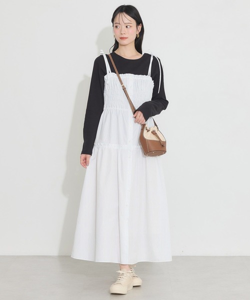 \2025 spring item/肩のリボンで愛らしさアップ◎ 軽やかギャザーティアードワンピース!ふんわりギャザーティアードデザインが魅力のワンピースは、1枚で主役になれる愛されアイテム。肩のリボンがアクセントになり、フェミニンさを引き立てながら、どこか遊び心のある仕上がりに。軽やかな素材感と優雅に広がるティアードシルエットが、春夏らしい爽やかさを演出します。#2025SS#ガーリー#バレエコア#フリル#リボン※画像はサンプル品を使用しているため、実際の商品とカラー、仕様、加工、サイズが若干異なる場合がございます。予めご了承ください。※モデル着用画像は光の当たり具合で色味が違って見える場合がございます。商品の色味は物撮りの画像をご参照ください。● earth music&ecology ●(アースミュージック&エコロジー)「いいことある服。」たかが服。されど服。波風の多い日々のなかでもほほえんで前を向くあなたを、つつんで一緒に歩きたい。 いいことあるかも。そんな期待までまとえる服をあなたに。earth music&ecologyは、毎日を頑張る女性たちをちょっと前向きにするブランドです。 ▼ 商品のお気に入り登録がおすすめです ▼商品ページ内の「♡」ハートマークをクリック。完売時の再入荷や、最後の1点の通知、コーディネート画像がアップされたとき、お得なお値下げの際の通知を受ける事ができます。【お知らせ】ページでも通知が確認できます。