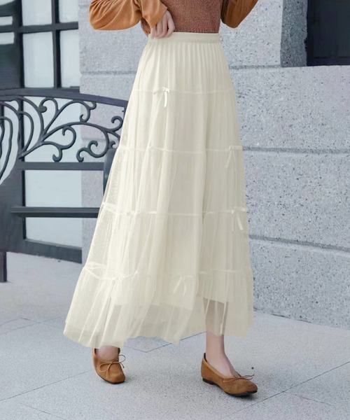 ふんわりとしたチュールが女性らしさを引き立てるロングスカートです。軽やかで透け感のあるデザインに、小さなリボンがアクセントとなり、上品さと可愛らしさを兼ね備えています。カラーは黒、ベージュ、ホワイトの3色展開で、どのシーンにも合わせやすいカラーバリエーションが魅力です。 • 素材:柔らかなチュール素材で軽やかな履き心地 • デザイン:リボンモチーフとふんわりとしたチュールでフェミニン • スタイル:カジュアルからフォーマルまで幅広く対応 • ウエスト:総ゴム仕様でらくらく 普段のお出かけから特別な日のコーディネートまで、さまざまなシーンで活躍する一枚です。