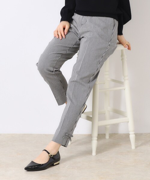 Couture Broochの定番パンツから春の新作が登場!裾に細めの共地リボンが付いたハイパーストレッチパンツ~POINT~リボン下にスリット入りで、着脱しやすく、足首がキレイに見えますスキニー程ピッタリはしない、スッキリとした細身シルエットですウエストぐるりゴム仕様で、楽チンな履き心地ですウエスト周りがスッキリとしているので、インナーパンツとしてもおすすめです【素材・機能】キレイ見えする、非常にストレッチのよく効く生地を使用しています色番によって、混率が多少違います094番ネイビーはデニム調の素材です【仕様】・ポケット数:横×2 後飾りポケット×2 ・ウエスト総ゴム・裏地なし※照明の関係により、実際よりも色味が違って見える場合があります。また、パソコン・スマートフォンなどの環境により、若干製品と画像のカラーが異なる場合もございます。【スタッフコメント】・saori(153 )履きやすく着回し力も抜群の万能パンツです!チュニック丈のトップスとの合わせもおすすめです◎キレイめなので通勤にも着用頂けます!【25SS NEW ARRIVAL】【25SS NEW COLLECTION】モデル情報:身長159cm B75 W56 H81 着用サイズ:38(M)店舗へのお問い合わせ商品番号:508-61005●製品寸法:34(SS):W65cm H86cm 股下63cm 前股上25cm 渡り幅27cm 裾幅13cm36(S):W67cm H88cm 股下63cm 前股上26cm 渡り幅28cm 裾幅13cm38(M):W70cm H91cm 股下65cm 前股上26cm 渡り幅29cm 裾幅14cm40(L):W73cm H94cm 股下66cm 前股上27cm 渡り幅30cm 裾幅15cm42(LL):W76cm H97cm 股下67cm 前股上27cm 渡り幅31cm 裾幅16cm備考: