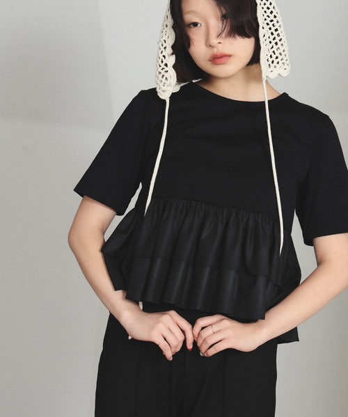 オンオフ使えるきれいめTシャツ■デザイン2種類の素材を組み合わせたTシャツ。裾を布帛素材にしたことで、ギャザーが細かく綺麗に入っているのがポイントです。高級感のある見た目なので、アクセサリーを合わせて通勤着やライトなオケージョンにもおすすめです。■コーディネート短丈なのでパンツやスカートなど幅広いボトムスと合わせやすいです。■サイズ身幅は広めで余裕のあるサイズ。■素材透け感の少ない天竺と軽めの布帛を使用。■ケア方法洗濯可(裏返してネットを使用)(詳細は商品についている品質表示ラベルをご覧ください)Model:H165 B77 W57 H85 Size:ONE SIZE生地の厚さ:普通透け感:なし伸縮性:なし光沢感:ややあり裏地:なし【スタッフレビュー】スタッフ:りかちょび身長:164cm / 普段サイズ:1 / 着用サイズ:ONE SIZEサイズ感: お尻が隠れる着丈。袖身幅はすっきりしており、程よいフィット感。素材感: しっかり目の生地。ティアード部分もハリがある。ポイント: ティアード部分はややハリと光沢がありカタチが綺麗。カジュアルすぎず、一枚でもおしゃれな印象に◎※光の当たり具合やパソコンなどの閲覧環境によって、実際の色味と異なって見える場合がございます。予めご了承ください。※商品の色味は商品単体で撮影した画像をご参照ください。