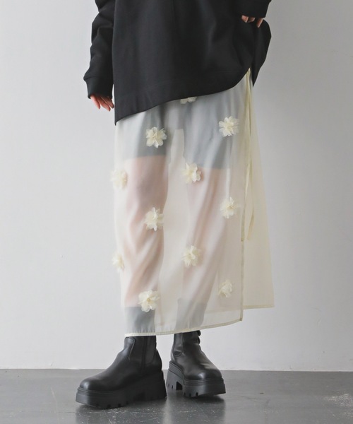 〜今季トレンドのレイヤードで楽しむオーガンジー素材の花モチーフラップスカート〜 【商品ポイント】 ・フロント部分には、立体感なフラワーモチーフが一つ一つ手付けされたオリジナルのテキスタイル ・程よい透け感のオーガンジー素材を使用したレイヤードスカート ・ウエストゴムで着脱しやすいです ・スリット部分には共布のリボンを付けており、自由に結べます ・ウエストから少し下の位置に共布リボンを縫い付けているため、トップスをアウトに着用した際にもリボンが見えるようになっています ・販売中のフラワーモチーフオーガンジーシャツとセット着用も可能です おすすめスタイリング ・シルキーサテンバイアススカートと組み合わせるのがデザイナーの一押しコーデ ・同色系のスカートと合わると洗練された印象に ・デニムやスラックス、スウェットパンツと合わせると今年らしいコーデになります ・あわせるトップスを変えて秋冬までレイヤードコーデが楽しめます **************** 光沢感⇨なし 生地の厚さ⇨程よい透け感 **************** サイズ F カラー ブラック/アイボリー 【SNS掲載情報】 @purebright_jp 公式Instagramアカウントにて新作情報をはじめ様々なコンテンツを掲載しております。 ぜひご覧ください! 【商品のお気に入り登録】 完売カラーの再入荷通知やラスト 1点の通知プライスダウンの通知も受け取ることができます。 ぜひご登録ください! 【ブランドのお気に入り登録】 新商品や再入荷などブランドの情報をいち早くお知らせしますぜひご登録ください! ※ご注意屋外の光や照明のあたり具合で、実際の商品の色味とカラー別画像の色味に若干の違いが発生する場合がございます。