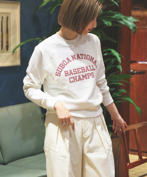 気取らないリラックススタイル ■デザイン 古着の要素を取り入れ、野球チームのユニフォームをイメージしデザインしたスウェット。世界観溢れるオリジナルロゴがポイントです。 ■コーディネート カジュアルなスタイルはもちろん、タイトスカートやアクセサリーで女性らしいコーディネートに仕上げるのもおすすめ。 ■ディテール 肩線の切り替えをS字ラインのフリーダムスリーブ仕様にし、腕の可動域を広くしています。 ■サイズ ややコンパクトな着丈ですっきりと着られる38サイズとメンズでも着用可能な46サイズの2サイズ展開。 ■素材 コットンの風合いにレーヨンの滑らかさがプラスされた柔らかな裏毛素材。春夏に着用しやすい薄手のスウェット地です。 ■ケア方法 手洗い可(詳細は商品についている品質表示ラベルをご覧ください) BEAMS STAFF:H165 Size:38 ********************** 生地の厚さ:やや厚手 透け感:なし 伸縮性:ややあり 光沢感:なし 裏地:なし ********************** 【スタッフレビュー】 Demi-Luxe BEAMSスタッフ 身長:159cm / 普段サイズ:38 / 着用サイズ:38 サイズ感: コンパクトな丈感。身幅はややゆったりとしたシルエット。 素材感: 柔らかい質感。厚すぎずロングシーズン着回せます。 ポイント: オンオフ使える古着のようなデザインが魅力。 Demi-Luxe BEAMSスタッフ 身長:165cm / 普段サイズ:38 / 着用サイズ:38 サイズ感: 身幅はゆとりがありますが、袖口はコンパクトですっきり見えます。 素材感: 透け感はなく、安心感のあるスウェット生地。 ポイント: 首が詰まったデザイン上品見えします。インナー使いにもおすすめ。 ※光の当たり具合やパソコンなどの閲覧環境によって、実際の色味と異なって見える場合がございます。予めご了承ください。 AK+1/エーケー ワン 亜希がディレクションするブランド。オーセンティックなメンズウエアのディテールを女性らしいパターンに落とし込んだベーシックウエアを中心に展開。経験を重ねた女性の魅力を引き出し、着るほどに身体に馴染み愛着が増すアイテムを取り揃え、“毎日が元気になるカジュアルスタイル”として提案します。