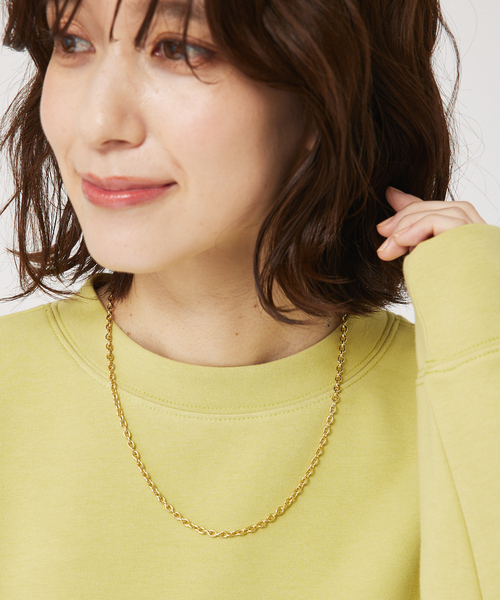 【Design】 シンプルなショートチェーンネックレス。どんなものにも合わせやすく大人カジュアルに出番の多いバランスが魅力。 【material】 全長47cm+5cmのアジャスター付き。 【Styling】 華奢すぎないので、ニット系とも相性◎春の軽い襟元もシンプルながら程よい華やかさをプラス出来ます。