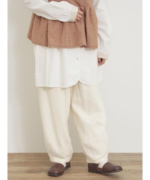 裾にダーツを加えた丸みのあるシルエットが可愛らしいツイルパンツ。 ウエストはゴム仕様になっており、安心感のある穿き心地なのも嬉しいポイント◎ 程よくゆとりがあるので肉感も拾いにくく、裾を絞ることですっきりとした印象に。 シンプルな無地やアクセントに映える柄生地などのバリエーションも魅力です。 ※商品画像は、撮影環境やお客様のご利用のPC・スマートフォンのモニター環境などにより実物と色味に差異がある場合がございます。 【その他採寸】 M ウエスト:[ゴム仕様]60cm L ウエスト:[ゴム仕様]66cm