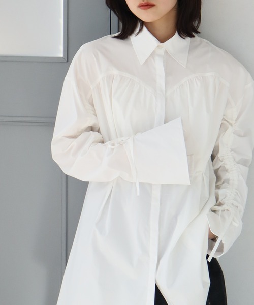 シンプルながらも印象的 シャーリングディテールがコーディネートのポイントになるデザインシャツ コーディネートが楽しくなる主役ブラウス ◇DESIGN ・フロント、バック、スリーブに入ったシャーリングデザインがポイントの長袖シャツ。 ・袖口のリボンがアクセントで女性らしい雰囲気を演出。 ・袖口にかけてドロストしたデザインは、ドロストの調整で袖丈の長さを変えて着用できます。 ・ヒップをカバーしてくれる長め丈で、着心地楽ちんなゆとりのあるシルエット。 ・比翼仕立てのデザインで甘すぎないシャープな印象に引き締めています。 ◇FABRIC ・さらりとした肌触りの布帛生地を使用。 ・程よい厚みで着こなし次第ではロングシーズン活躍します。 ◇STYLING ・1枚で着るだけでコーデが決まるようなデザイン性の高い今季らしいアイテムです。 ・インナーやレイヤードスタイルに活用しやすく、お好みの雰囲気でスタイリングいただけます。 【NOGLE/ノグル】 上品さと遊び心をもちながら、 変わらずに心地よく着続けられるもの。 ■公式インスタグラム @nogle_official ★商品のお気に入り登録→【カートに入れる】右側のハートマークをクリック 完売カラーの再入荷通知や、ラスト1点の通知、セールの通知も受け取ることができます。 ※店頭及び屋外での撮影画像は、光の当たり具合で色味が違って見える場合があります。またご覧いただきますモニターや使用環境により実際の商品と多少色味が異なって表示される場合がございます。 予めご了承をお願いいたします。
