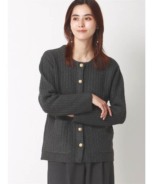 アイテム説明ノーカラージャケットとしても、カーディガンとしても着用出来るニットジャケット。ツイード調の手の込んだ編地で、ニットのカジュアル感を緩和。オフスタイルはもちろん、オフィスでも使いやすいデザインです。 ・ゴールドのメタルボタンが、ツイードライクな編地と相まってトラッドな印象に♪ ・長すぎない着丈とボックスシルエットで、パンツ、スカートともに好相性 ・ポリエステルをベースにした軽めの素材で、季節の変わり目から長く着回し出来る ・ふっくらとした弾力でストレッチ性にも優れ、動きやすくノンストレスな着心地 ・ジャケット代わりに着回ししやすい、「ネイビー」と「チャコールグレー」をご用意 アイテム詳細【仕様】ラウンドネック/長袖/6つボタン 【柄】織柄 【素材】ポリエステル61%/ナイロン23%/アクリル12%/ウール4% 【洗濯表示】手洗い可 モデル:168cm B80cm W59cm H87cm 着用サイズ:38 【38】着丈63cm バスト96.0cm 肩幅42.0cm 袖丈54.0cm ーーーーーーーーーーーーーーーーーーーーーーーーーーーー 【スタッフ着用コメント】 ①女性スタッフ 身長:160cm ・着用サイズ 38 ・着用感 ジャカード編みでしっかりめの生地でした! アウターよりも軽く羽織れるので、肌寒さを感じる季節にぴったりです♩ 一枚でプルオーバーとしてはもちろん、前を開けてカーディガンとして着られるメニーウェイ◎ 程良いゆとりのあるシルエットなので、キレイなシルエットをキープしたままレイヤードが楽しめます♩ ➁女性スタッフ 身長:164cm ・着用サイズ 38 ・着用感 ジャケット代わりにもサラッと羽織ってオフィススタイルがサマになる。 ツイード調の編地で立体感もあり、コーデのポイントになります♪ ーーーーーーーーーーーーーーーーーーーーーーーーーーーー 【おすすめシーン】 オフィスカジュアル、ビジネス、仕事、通勤 お出かけ、ショッピング、食事会、お呼ばれ、デート、女子会 ※商品の仕上がりサイズ(出来上がり寸法)は上記のサイズ表をご覧下さい。 ※お届けする商品の下げ札・タグに記載の数値は目安としてのヌードサイズ(体の寸法)のため上記表示と異なる場合がありますが、誤表記ではございません。 ※同サイズまたは同一商品でも、生産の過程で1.0cm〜2.0cm程度の個体差や着用感の違いが生じる場合がございます。 ※カラー名は管理用の表記となります。実際の商品の色味は商品画像をご確認ください。 ※商品画像はできる限り実際の色に近づけて掲載しておりますが、パソコン環境により色味に誤差が生じる場合がございます。予めご了承下さいませ。